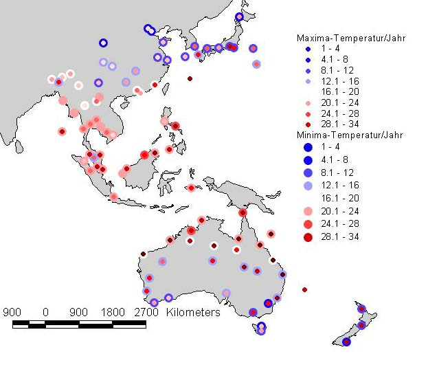 Der ozeanische Raum wird in der Literatur unterschiedlich eingegrenzt. Meist sind die Inseln des Pazifik ohne Hawaii eingeschlossen1. Oft werden Australien und Neuseeland noch dazugenommen. Gelegentlich werden auch angrenzende Staaten wie China noch mit eingeschlossen. In diesem Fall waren die Klimastationen durch Vorauswahl gegeben. In Einfügung findet sich eine Übersicht über alle Klimastationen, was einer sehr weiten Auslegung des Ozeanischen Raumes entspricht. Der nördlichste Punkt ist Haerbin (China) mit einer dez. Nördl. Breite von 45,75°. Der südlichste Punkt ist Dunedin (Neuseeland) mit der Südl. Breite von 45,92°. Demnach erstreckt sich das Gebiet in den Breiten gleichmäßig ca. 5.000 km um den Äquator. Die östlichste Länge hat Suva (Fidji-Inseln) mit (dez.) 178,43° Östl. Länge nahe an der Datumsgrenze, die westlichste Station ist Yatung (Buthan) mit 88,92° Östl. Länge im Himalaya.