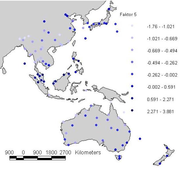 Mit Ladungen sämtlich über 827 zeigt der Faktor 5 eindeutig die Verteilung des Niederschlags im November. Also Herbstregen auf der Nord- und Frühlingsregen auf der Südhalbkugel. Natürlich erscheinen wegen des oft täglichen Regens auch hier wieder die Immerfeuchten Tropen. Ansonsten sind besonders die Südostküste Australiens, Tasmanien und Neuseeland hoch beeinflußt.