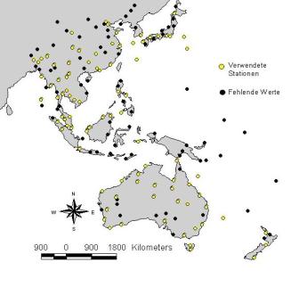 Der ozeanische Raum wird in der Literatur unterschiedlich eingegrenzt. Meist sind die Inseln des Pazifik ohne Hawaii eingeschlossen1. Oft werden Australien und Neuseeland noch dazugenommen. Gelegentlich werden auch angrenzende Staaten wie China noch mit eingeschlossen. In diesem Fall waren die Klimastationen durch Vorauswahl gegeben. In Einfügung findet sich eine Übersicht über alle Klimastationen, was einer sehr weiten Auslegung des Ozeanischen Raumes entspricht. Der nördlichste Punkt ist Haerbin (China) mit einer dez. Nördl. Breite von 45,75°. Der südlichste Punkt ist Dunedin (Neuseeland) mit der Südl. Breite von 45,92°. Demnach erstreckt sich das Gebiet in den Breiten gleichmäßig ca. 5.000 km um den Äquator. Die östlichste Länge hat Suva (Fidji-Inseln) mit (dez.) 178,43° Östl. Länge nahe an der Datumsgrenze, die westlichste Station ist Yatung (Buthan) mit 88,92° Östl. Länge im Himalaya.