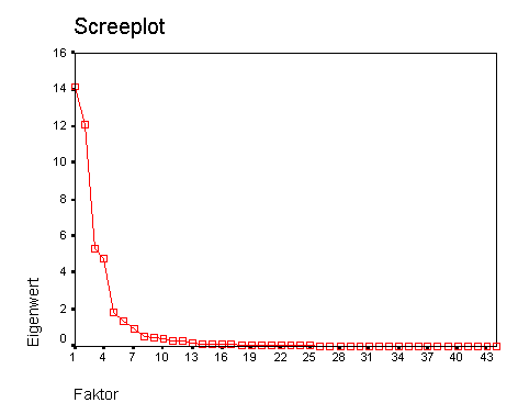Bei der Faktorenanalyse geht es um die Verringerung der Datenmengen bei großer Variablenzahl. Zunächst galt es, die passende Anzahl Faktoren herauszufinden, deren Gesamtvarianz möglichst hoch ist, ohne wieder zuviele Faktoren zuzulassen. Schwierig gestaltete sich dabei die Auswahl der Variablen, weil es so viele fehlende Werte gab.